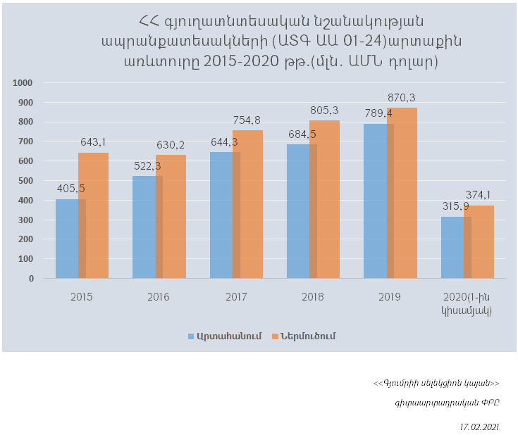2015-2019թթ. ՀՀ գյուղատնտեսական նշանակության ապրանքատեսակների (ԱՏԳ ԱԱ 01-24) ներմուծման և արտահանման ծավալների հարաբերակցությունը նվազել է՝ շուրջ 27,1%, որը 2015-ին կազմում էր 36,3%, իսկ 2019-ին 9,2%: